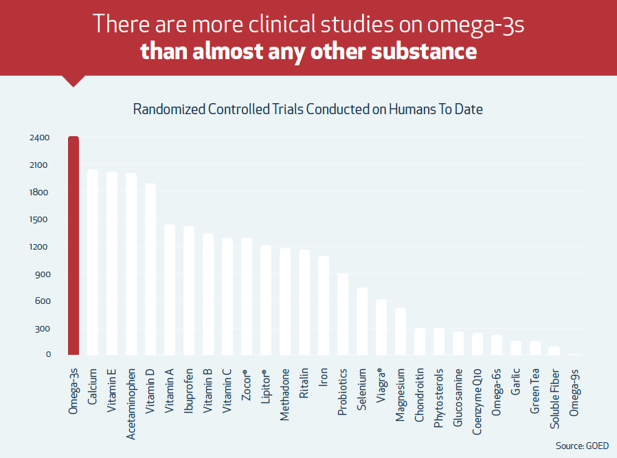 The Global Organization for EPA/DHA (GOED) states that omega-3s are one of the most researched nutrients in the world. There are more studies on omega-3s than almost any other substance. That includes more studies than what has been conducted on Ibuprofen, calcium, Vitamin D and even Lipitor®.